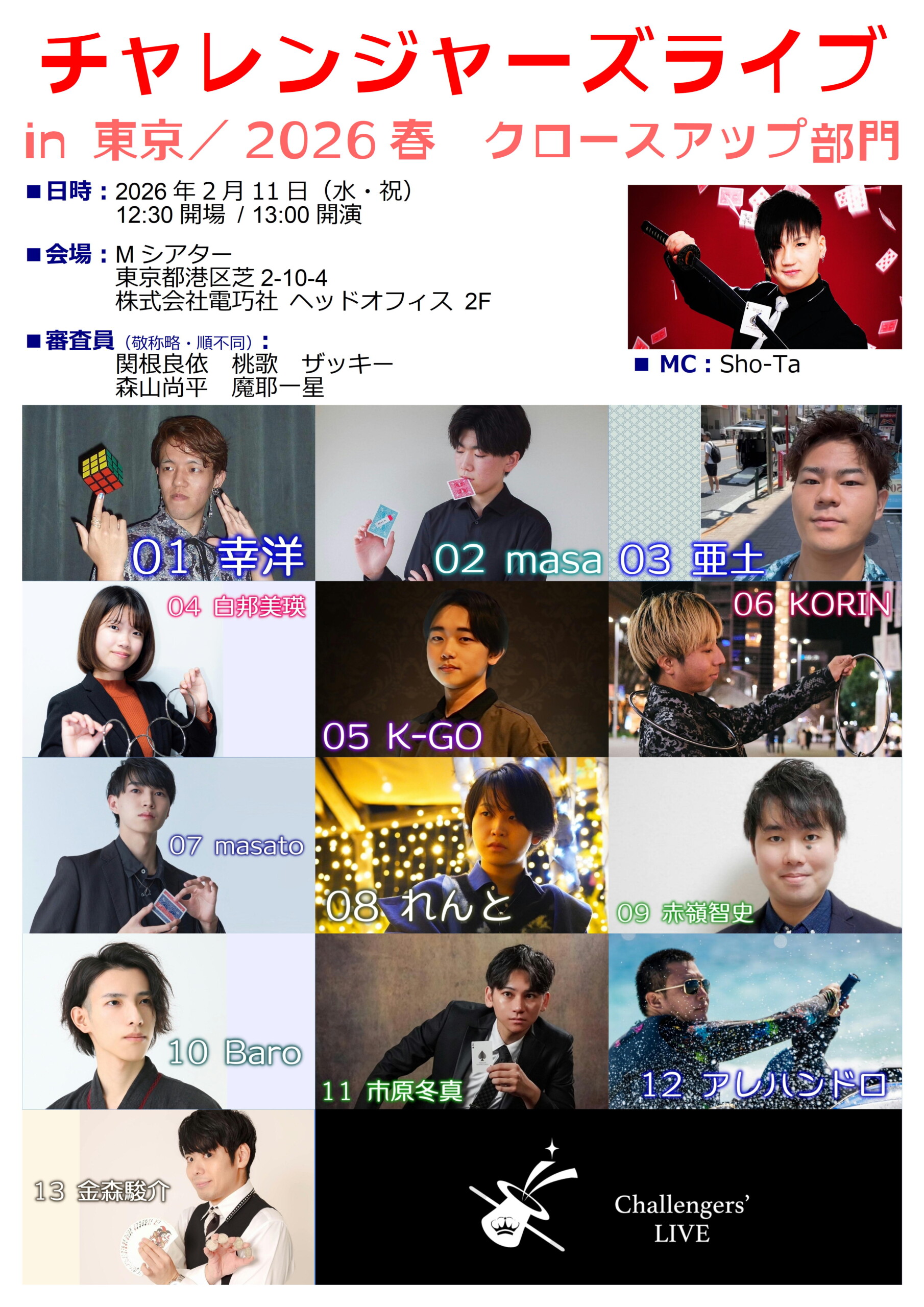 チャレンジャーズライブ2026春 in 東京 クローズアップ部門 ■開催日:2026年2月11日(水・祝)■会場:東京・芝 Mシアター チケットはこちら The Japan Cup 2026 (第25 回) ■開催日:2026 年3 ⽉7 ⽇(⼟)■会場:東京・紀尾井町紀尾井フォーラム・ホテルニューオータニ チケットはこちら